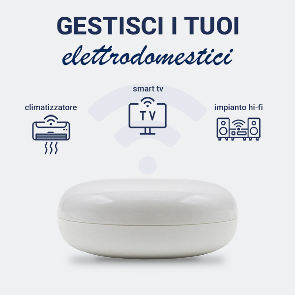 Il telecomando smart a infrarossi deve essere sempre connesso alla rete elettrica, non è dotato di batterie. Nella confezione è incluso l’alimentatore.
